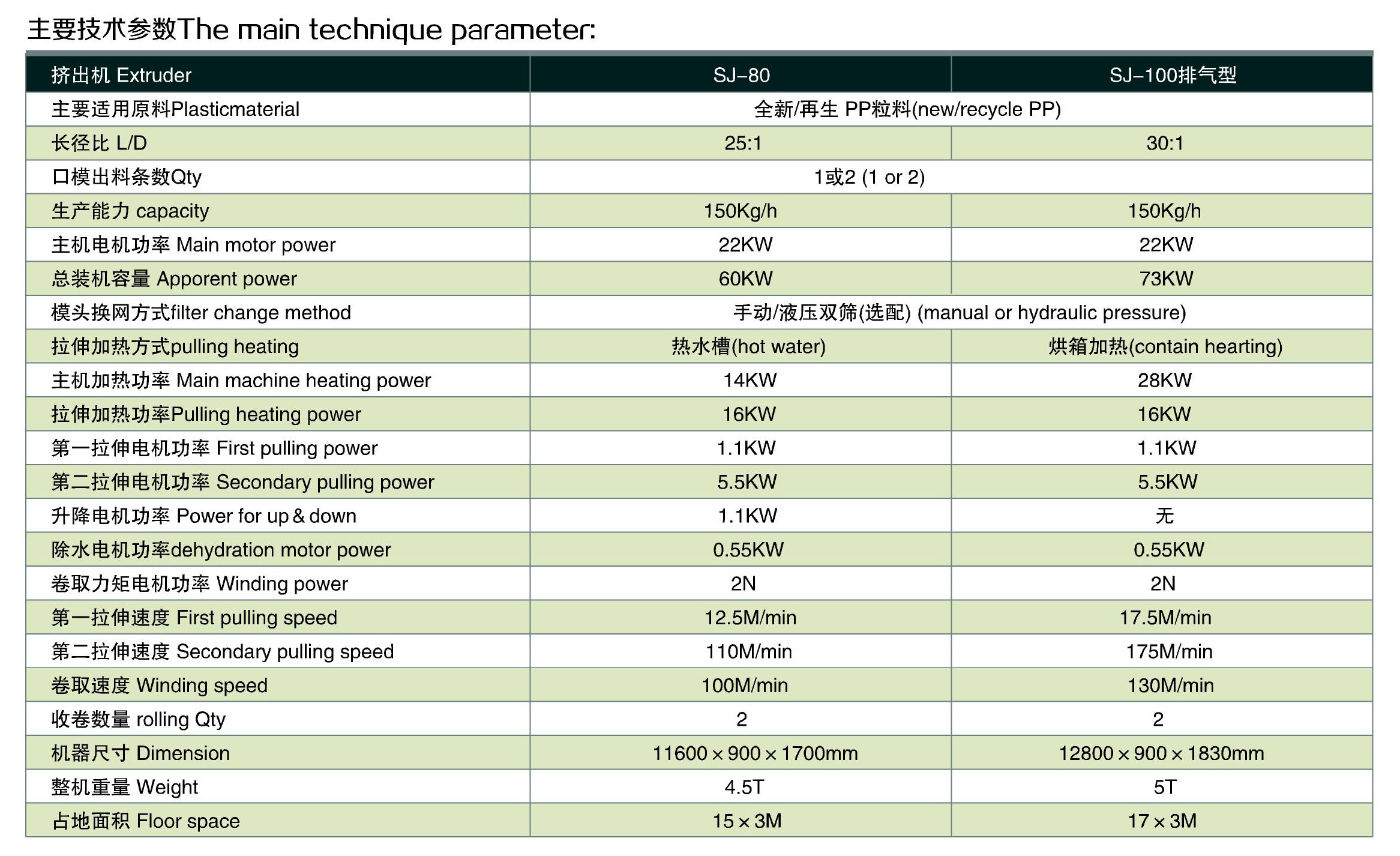 The machine consist of extruder, mould, cooling, heating, strectching, embossing, winding, electric ect 10 parts. The screw design specially for PP material, Die clearance adopts the design of adjustable, To transform the product specifications, the machine operating safety and reliability, the technical indicators have reached the advanced level in the same type of prototype.