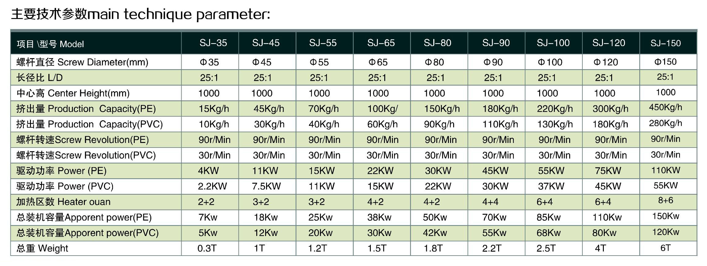 SJ series single screw extruder with appropriate screws, dies and other auxliliares can convert thermoplastic, for producing PP, PE, PS, ABS, PMMA, PVC , PC and other plastic pipes, board, sheet, bar mater, special-shaped materials and plastic granules.
